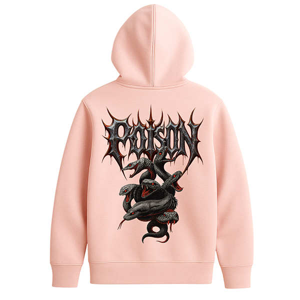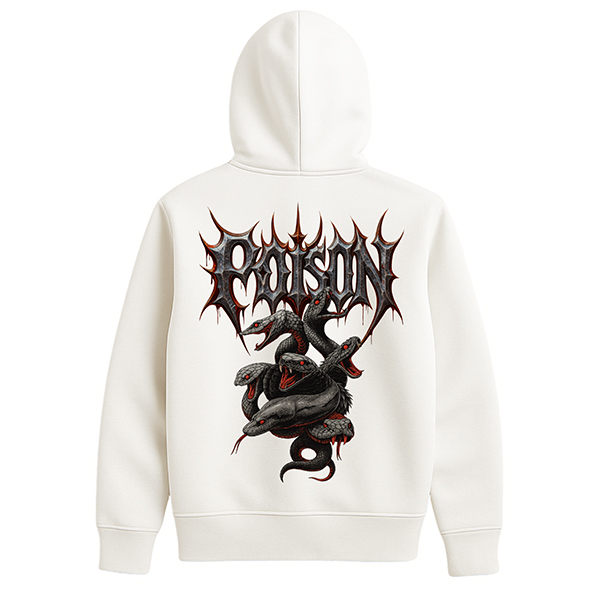 La sudadera Snake Poison negra con capucha de CUSTOMLAB es la pieza definitiva para amantes del streetwear oscuro y del imaginario metalero. El negro profundo del tejido sirve como base ideal para la ilustración en rojo y gris: un racimo de serpientes entrelazadas que se arremolinan bajo un logo POISON lleno de pinchos. El contraste es brutal y convierte a esta sudadera en una de las prendas con más carácter de la colección.