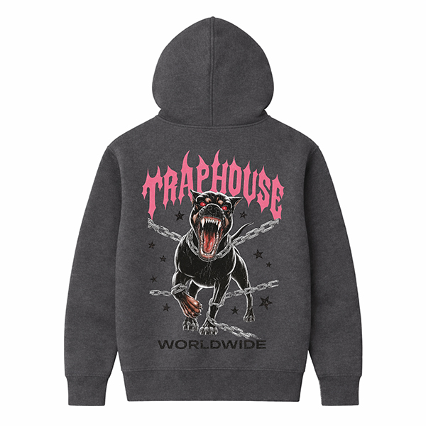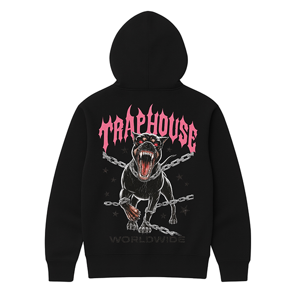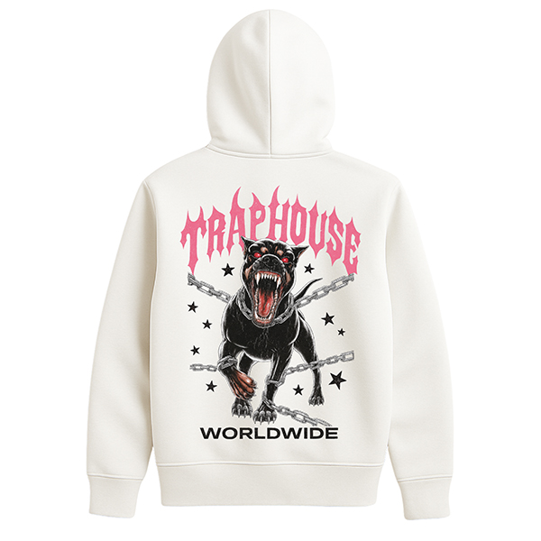 La sudadera Traphouse Pink con capucha de CUSTOMLAB trae toda la energía de la escena trap a una prenda pensada para la calle. En el frontal domina un perro negro encadenado, con la boca abierta y una expresión que mezcla rabia y control, como si estuviera listo para soltarse en cualquier momento. Detrás del animal se cruzan cadenas metálicas y pequeñas estrellas negras, y en la parte superior destaca un logo TRAPHOUSE en rosa intenso con una tipografía afilada que parece sacada de un flyer de club. Remata la composición el texto WORLDWIDE en la parte baja, dejando claro que la actitud es global.
